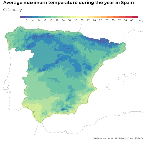 title = "Average maximum temperature during the year in Spain",