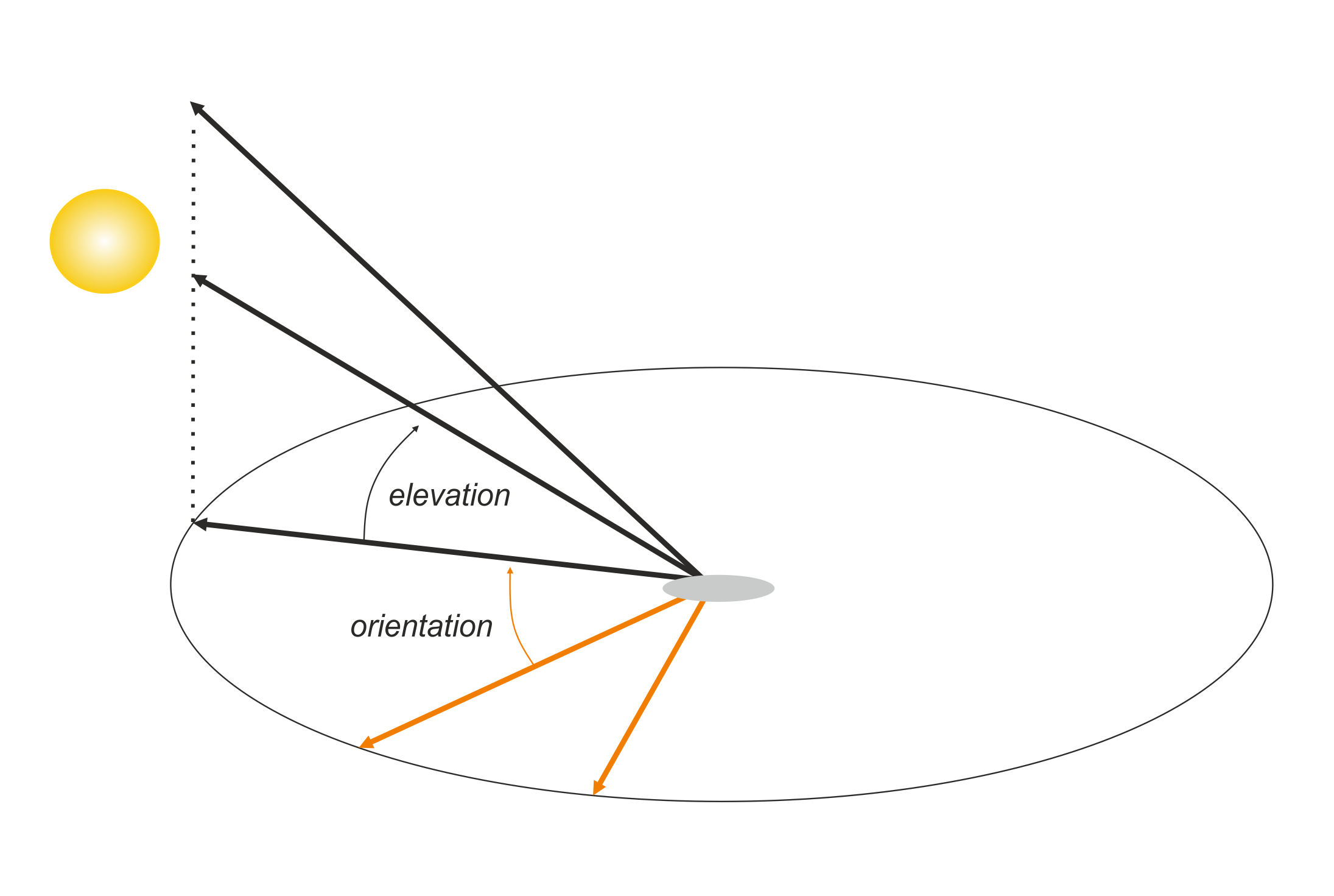Let’s remember that the hillshade effect is nothing more than adding a hypothetical illumination with respect to a position of a light source to gain depth. Shadows depend on two variables, azimuth, the angle from the orientation on the surface of a sphere, and elevation, the angle from the height of the source.