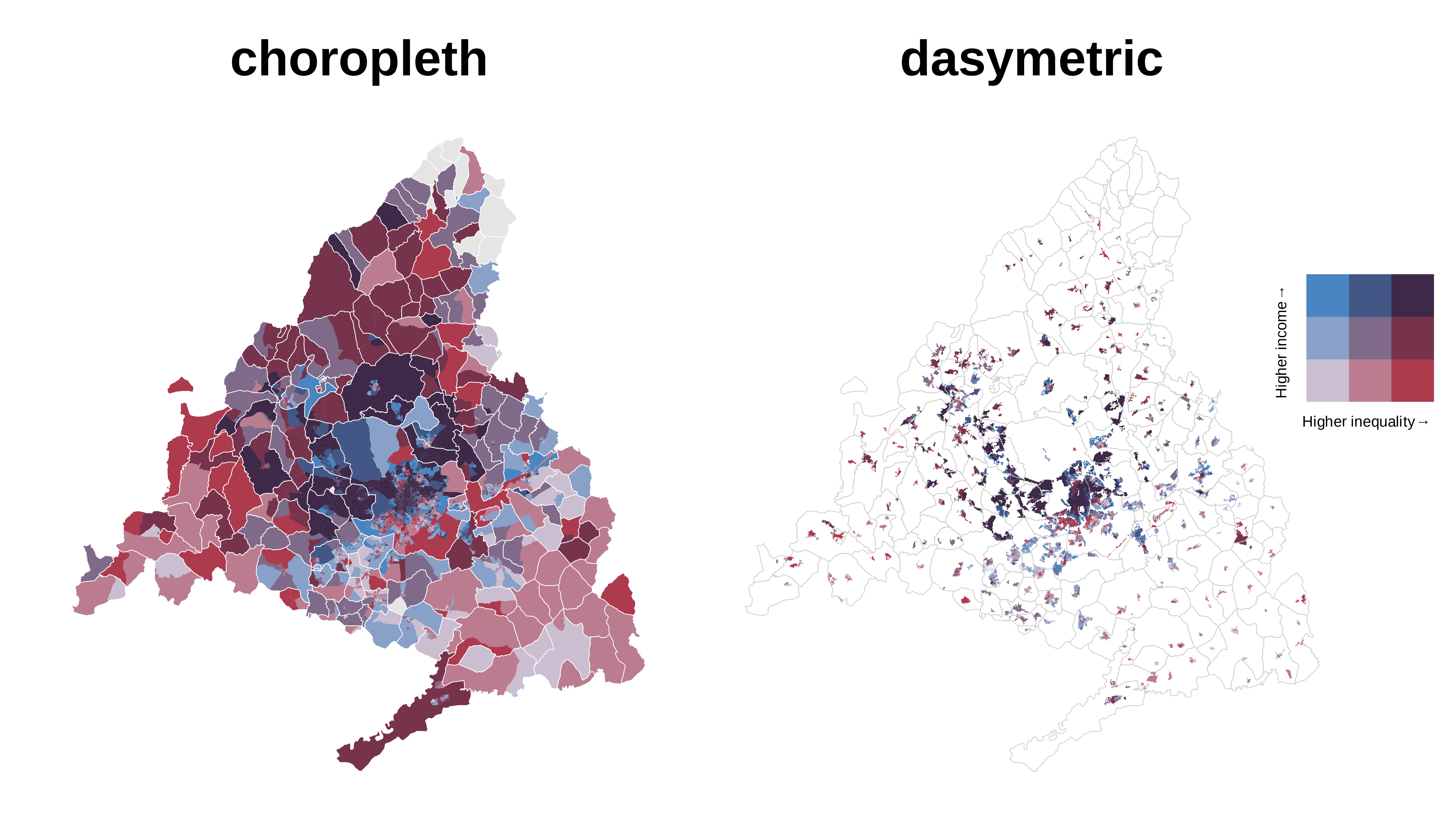 With the help of the patchwork package, we combine both maps in a single row, first the choropleth map and on its right the dasymmetric map. More details of the grammar used for the combination of graphics here.