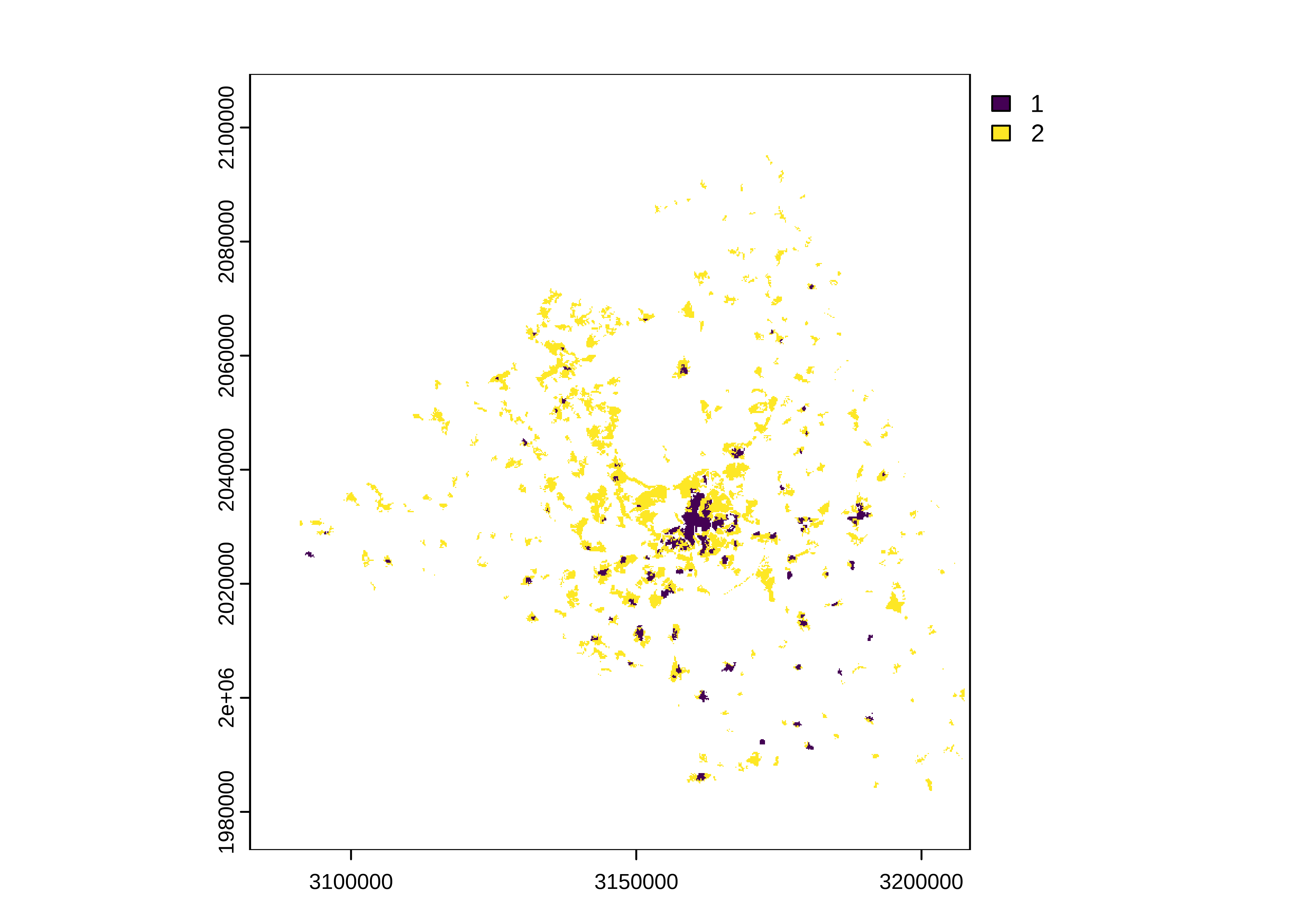 In the next step we cut the land use raster with the limits of Madrid. I recommend always using the crop() function first and then mask(), the first function crop to the required extent and the second mask the values. Subsequently, we remove all the cells that correspond to 1 or 2 (urban continuous, discontinuous). Finally, we project the raster.