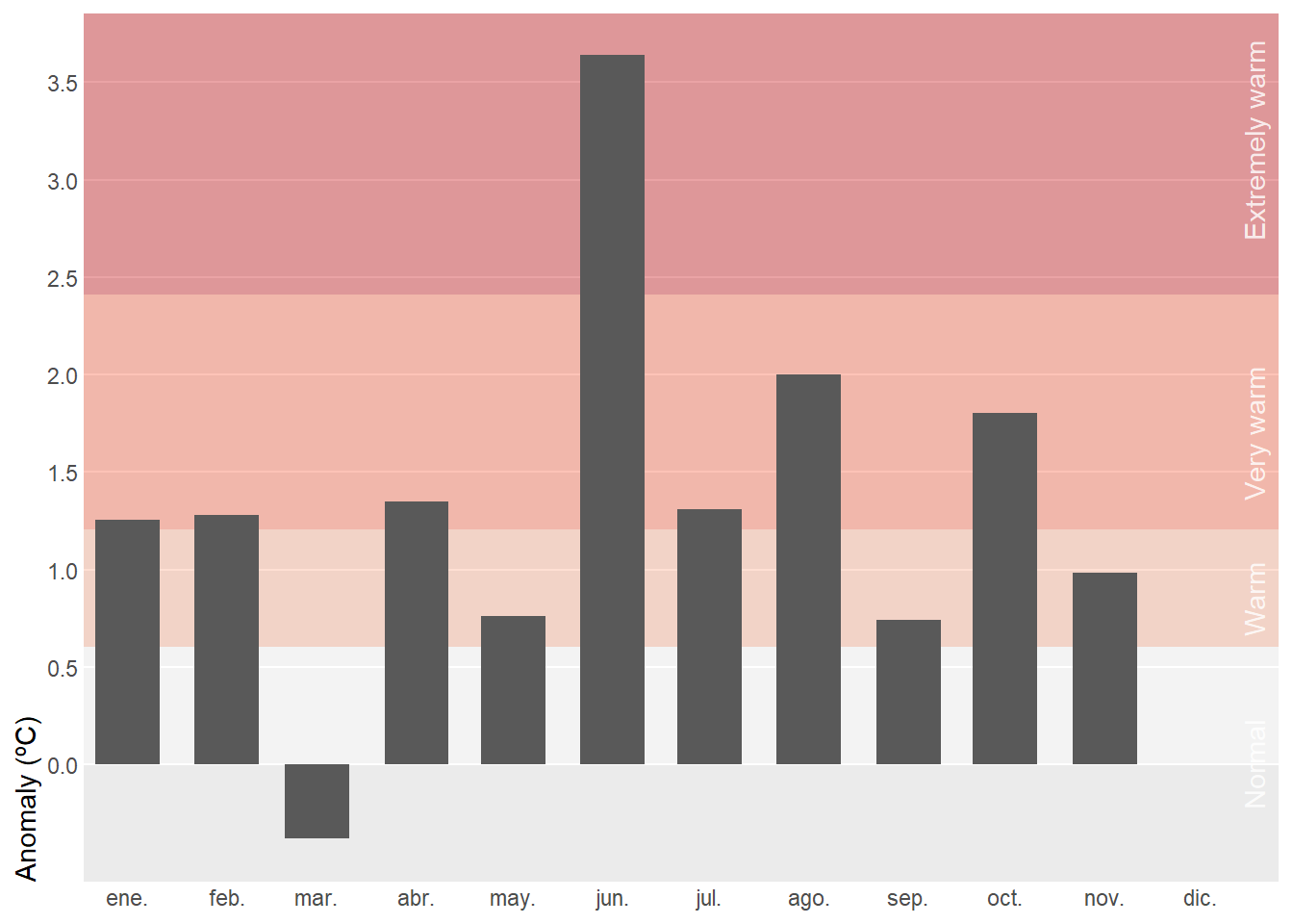 # standard deviation for the whole yearstd_7120<-filter(tmed_esp, between(year(yrmo), 1991, 2020))|># shortcut for x >= left & x <= rightleft_join(norm_p1, by ="mo")|>summarise(std =sd(tmed-tmed_norm, na.rm =TRUE))|>pull(std)# anomaly plot left_join(tmed_esp, norm_p2, by ="mo")|>filter(year(yrmo)==2025)|># filter only current yearmutate(anom =tmed-tmed_norm)|># anomalyggplot(aes(yrmo, anom))+# background for severity thresholdsannotate("rect", xmin =-Inf, ymin =c(0, std_7120*.5, std_7120, std_7120*2), xmax =Inf, ymax =c(std_7120*.5, std_7120, std_7120*2, Inf), fill =c("white", "#fcae91", "#fb6a4a", "#cb181d"), alpha =.4)+# severity labels at right sideannotate("text", x =ymd("2025-12-01"), y =c(0, .85, 1.7, 3.2), angle =90, vjust =3, label =c("Normal", "Warm", "Very warm", "Extremely warm"), alpha =.8, color ="white")+# column for anomaliesgeom_col(width =20)+scale_x_date(date_breaks ="month", date_labels ="%b", expand =expansion(c(.01, .07)))+scale_y_continuous(breaks =seq(0, 5, .5), expand =expansion(c(0, .05)), limits =c(-std_7120*.5, NA))+labs(x =NULL, y ="Anomaly (ºC)")+theme( panel.grid.minor =element_blank(), axis.ticks =element_blank(), axis.title.y =element_text(hjust =0), panel.grid.major.x =element_blank(), panel.grid.major =element_line(colour ="white"))