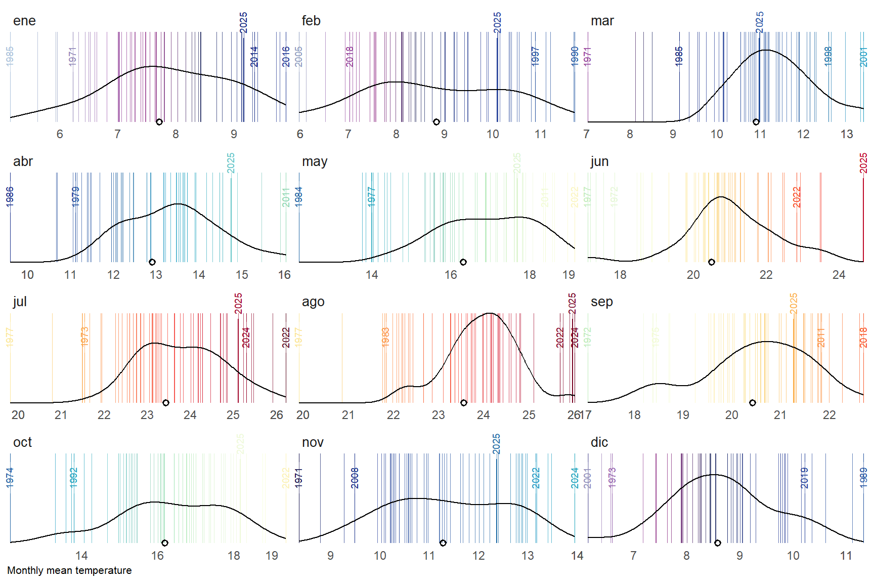 # barcode plotggplot(tmed_esp)+# barcode vertical linesgeom_vline(aes(xintercept =tmed, colour =tmed), alpha =.7, linewidth =0.1)+# selected extreme years with labelgeom_textvline( data =obs_lab_sel,aes( xintercept =tmed, label =year(yrmo), colour =tmed), linewidth =0.1, hjust =.8, size =2.5, vjust =.5)+# current year labels geom_textvline( data =obs_current,aes( xintercept =tmed, label =year(yrmo), colour =tmed), linewidth =0.4, hjust =1.3, size =2.5, vjust =.5)+# add density distribution based on reference periodgeom_density(data =filter(tmed_esp, year(yrmo)%in%1991:2020), aes(tmed))+# add average value from reference period for each monthgeom_point(data =med, aes(x =normal, y =0), shape =1, stroke =1)+scale_colour_gradientn( colours =col_temp, limits =c(4.4, 26.8), guide ="none")+scale_x_continuous( breaks =custom_breaks, expand =expansion(.01))+scale_y_continuous(expand =expansion())+labs(y =NULL, x ="Monthly mean temperature")+facet_wrap(mo_lab~., ncol =3, scale ="free_x")+coord_cartesian(clip ="off")+theme_minimal()+theme( axis.text.y =element_blank(), axis.ticks.y =element_blank(), panel.grid =element_blank(), axis.title.x =element_text(hjust =0, size =8), strip.text.x =element_text(hjust =0, size =10))