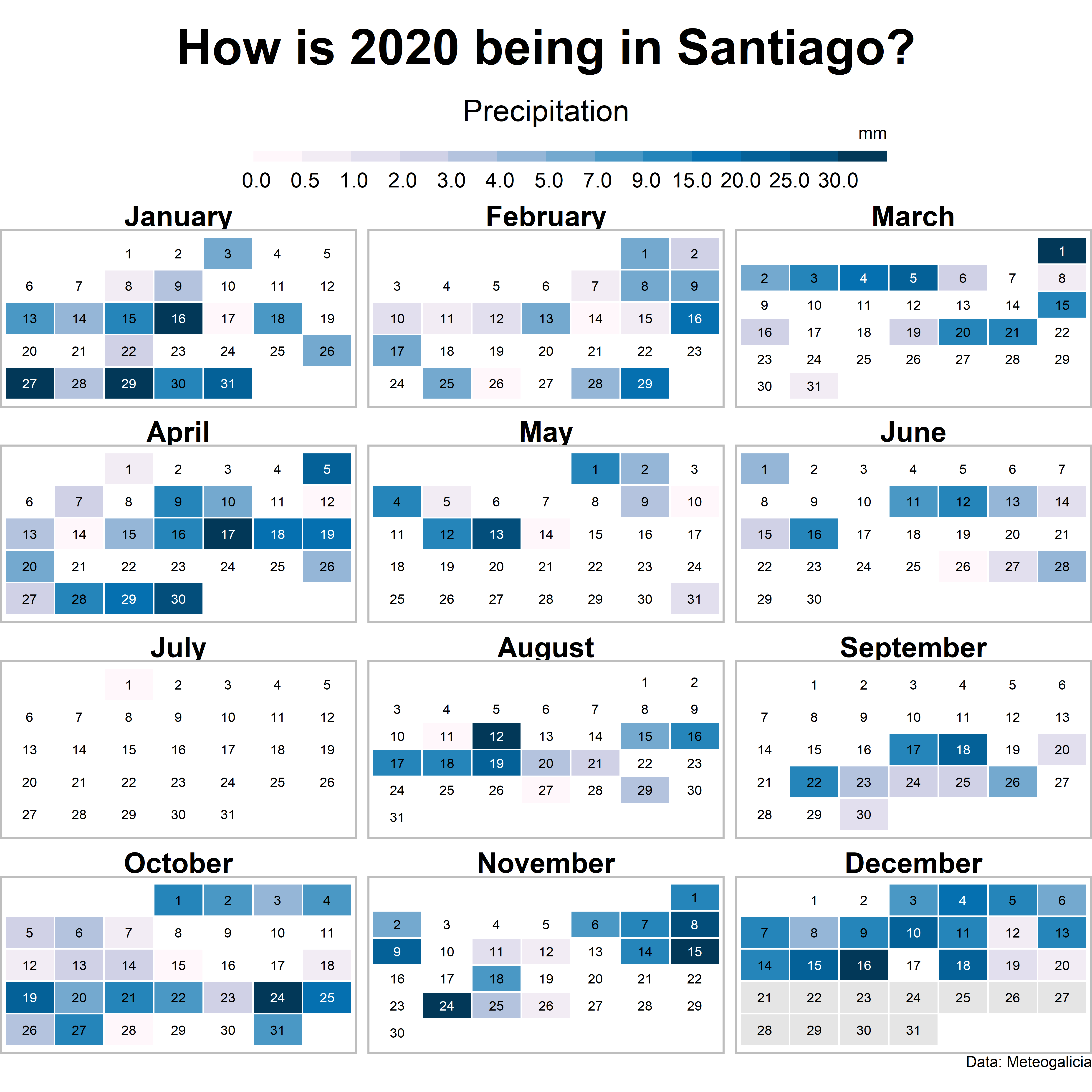 In this example we will use the daily precipitation of Santiago de Compostela for this year 2020 (until December 20). Download data