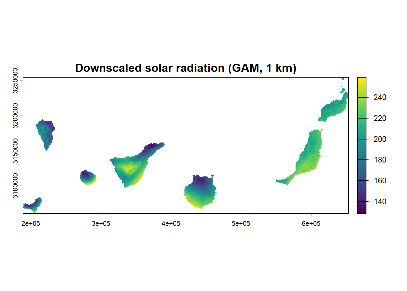 I’ve been meaning to write a post on how we can push interpolation and downscaling— beyond the usual tools like linear regression or kriging when dealing with climate data. This post illustrates a statistical downscaling workflow for monthly radiation over the Canary Islands using a Generalized Additive Model (GAM). We start from a coarse ~4km signal, learn its relationship with topography and MODIS cloudiness, and then predict to a finer 1km grid. The approach is intentionally lightweight: a single-month example (January) and a compact set of predictors.
