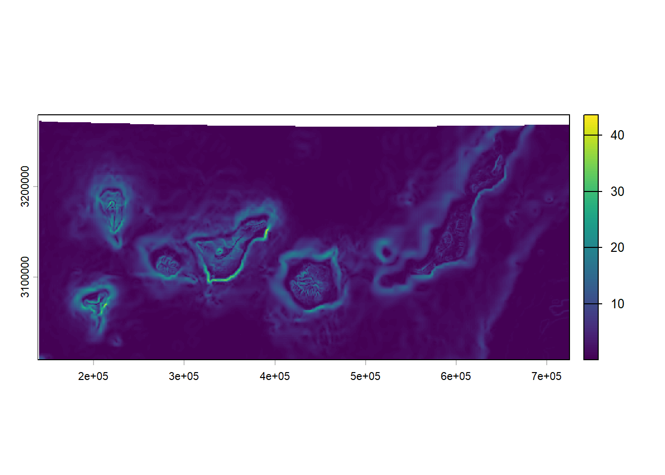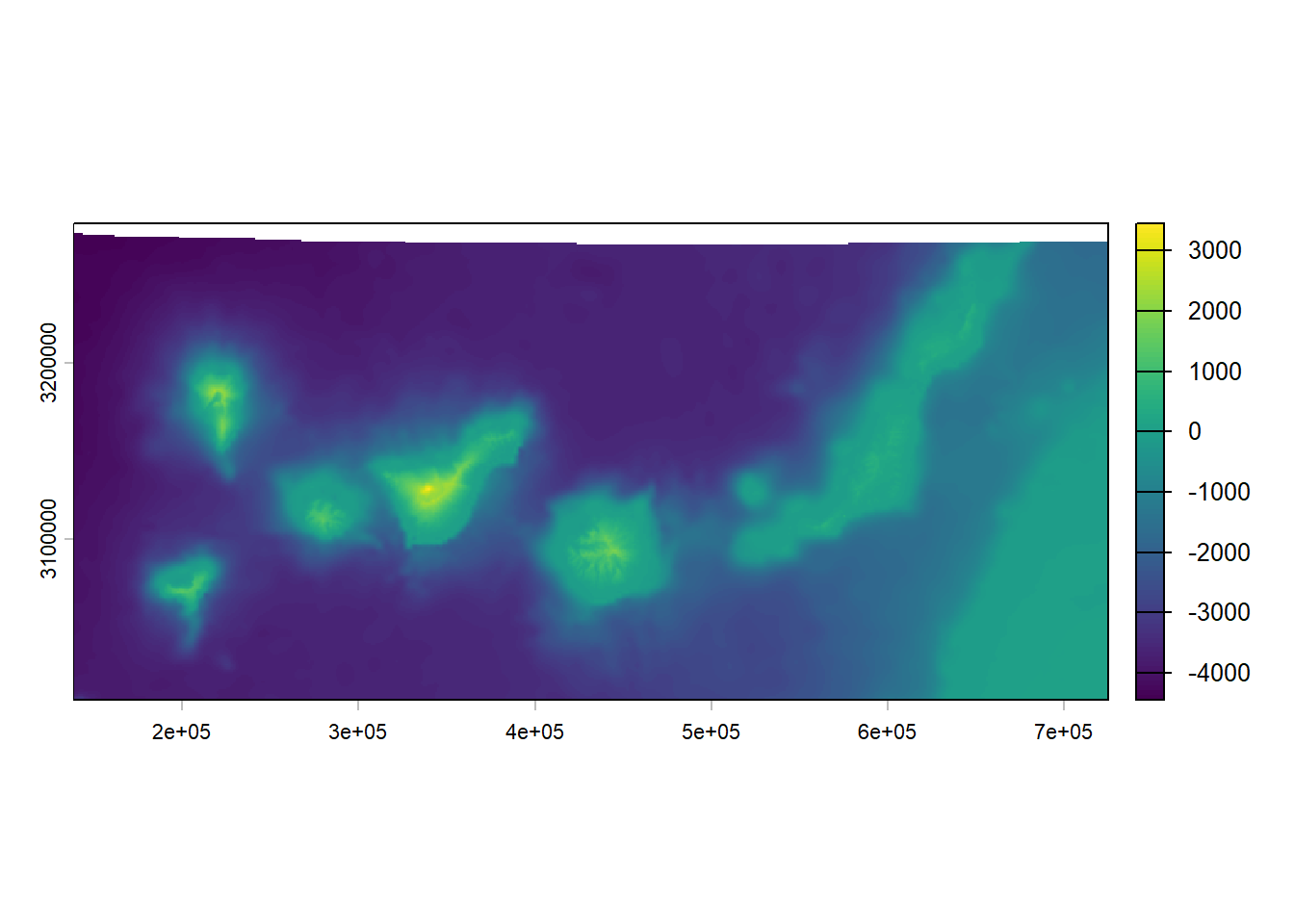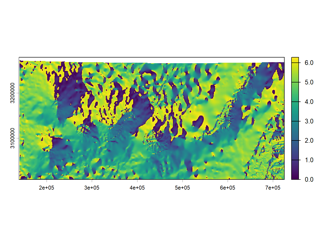 plot(elev_1km)Computing slope or aspect directly at 4km loses important terrain information because the coarse resolution smooths out real topographic variability. By deriving these metrics at 1km first, you preserve the finer‑scale gradients before aggregating them.