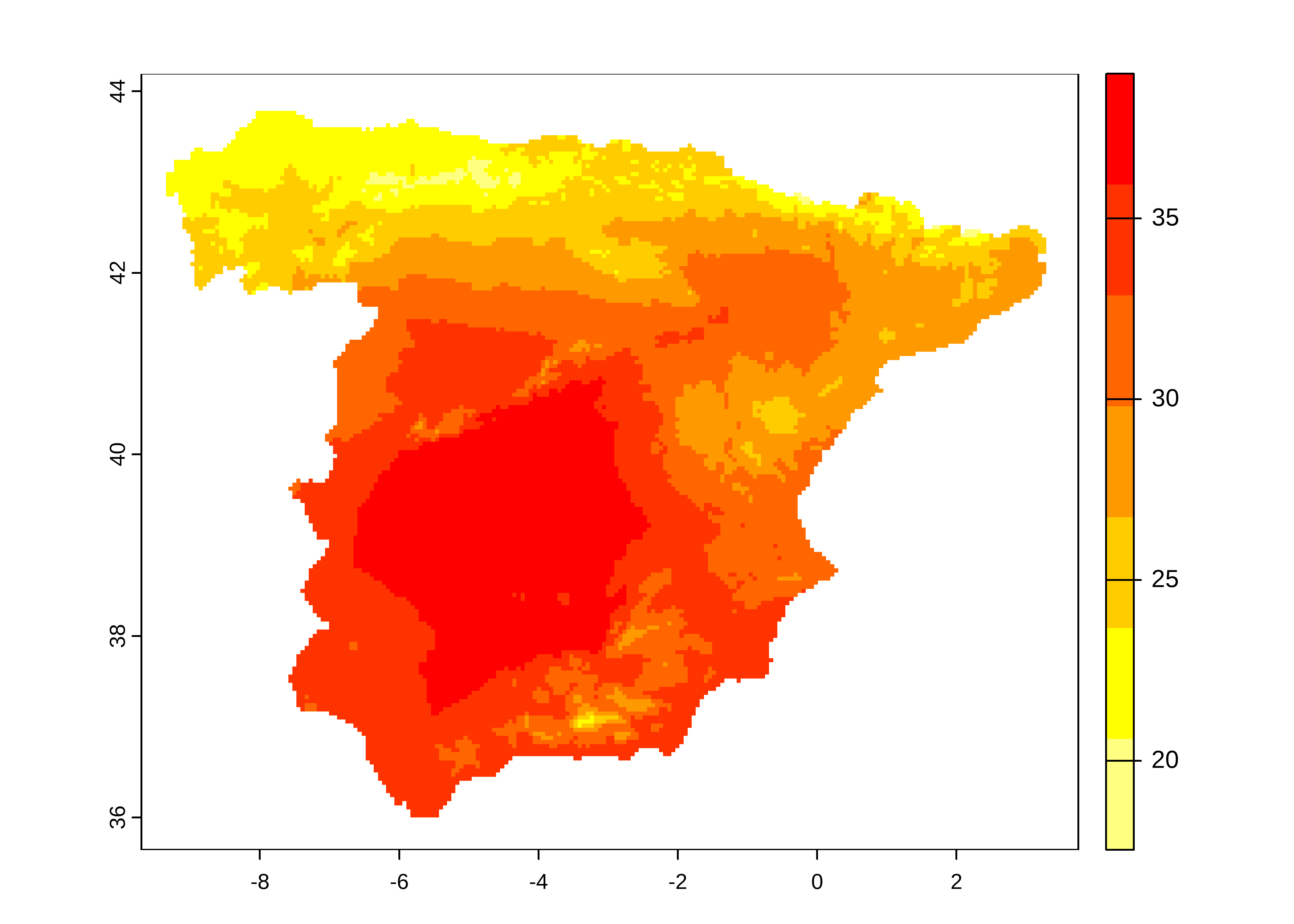 plot(map)Third, we create a vector with the day of the year as labels in order to include them later in the animation. In addition, we define the break points for the maximum temperature, adapted to the distribution of our data, to obtain a categorization with a total of 20 classes.