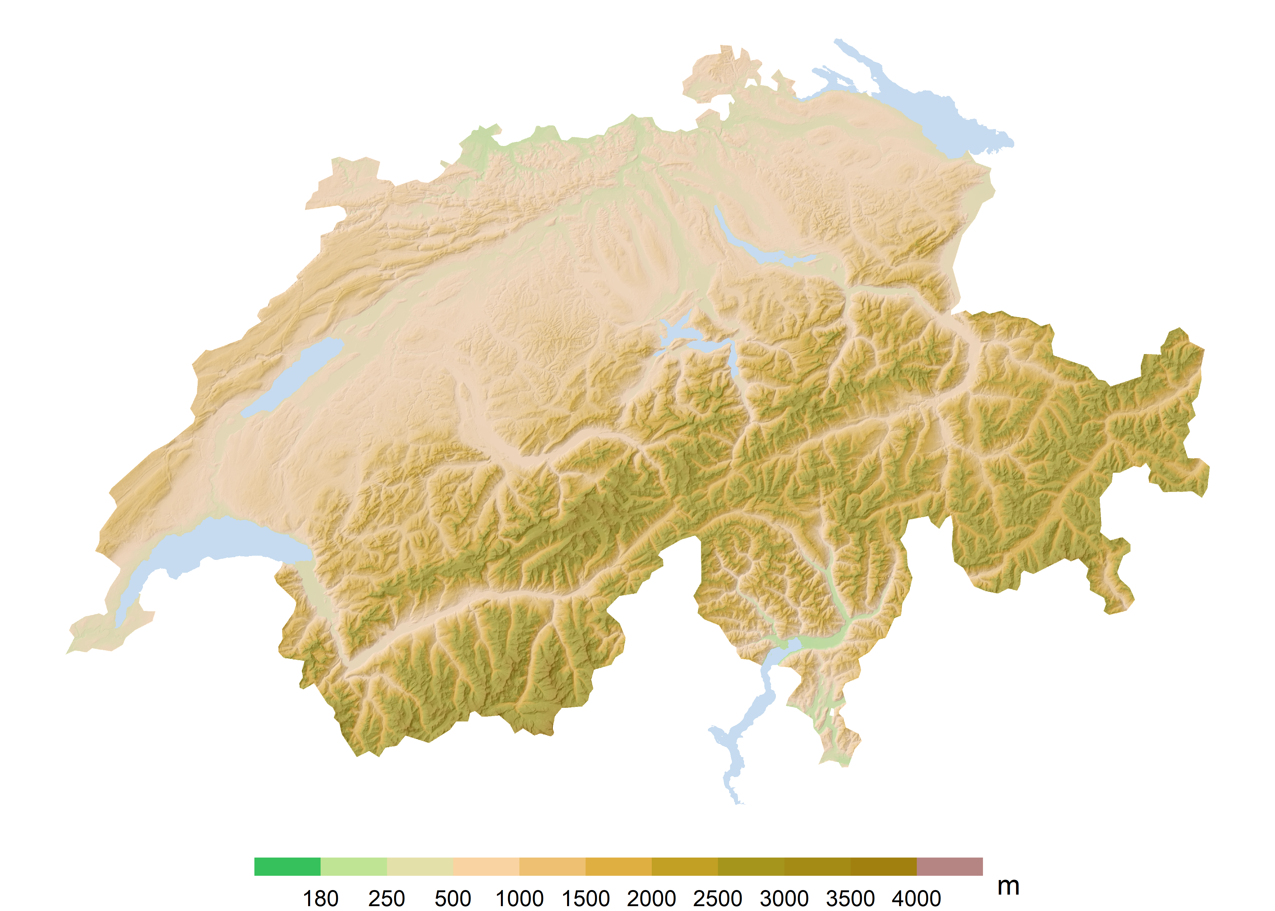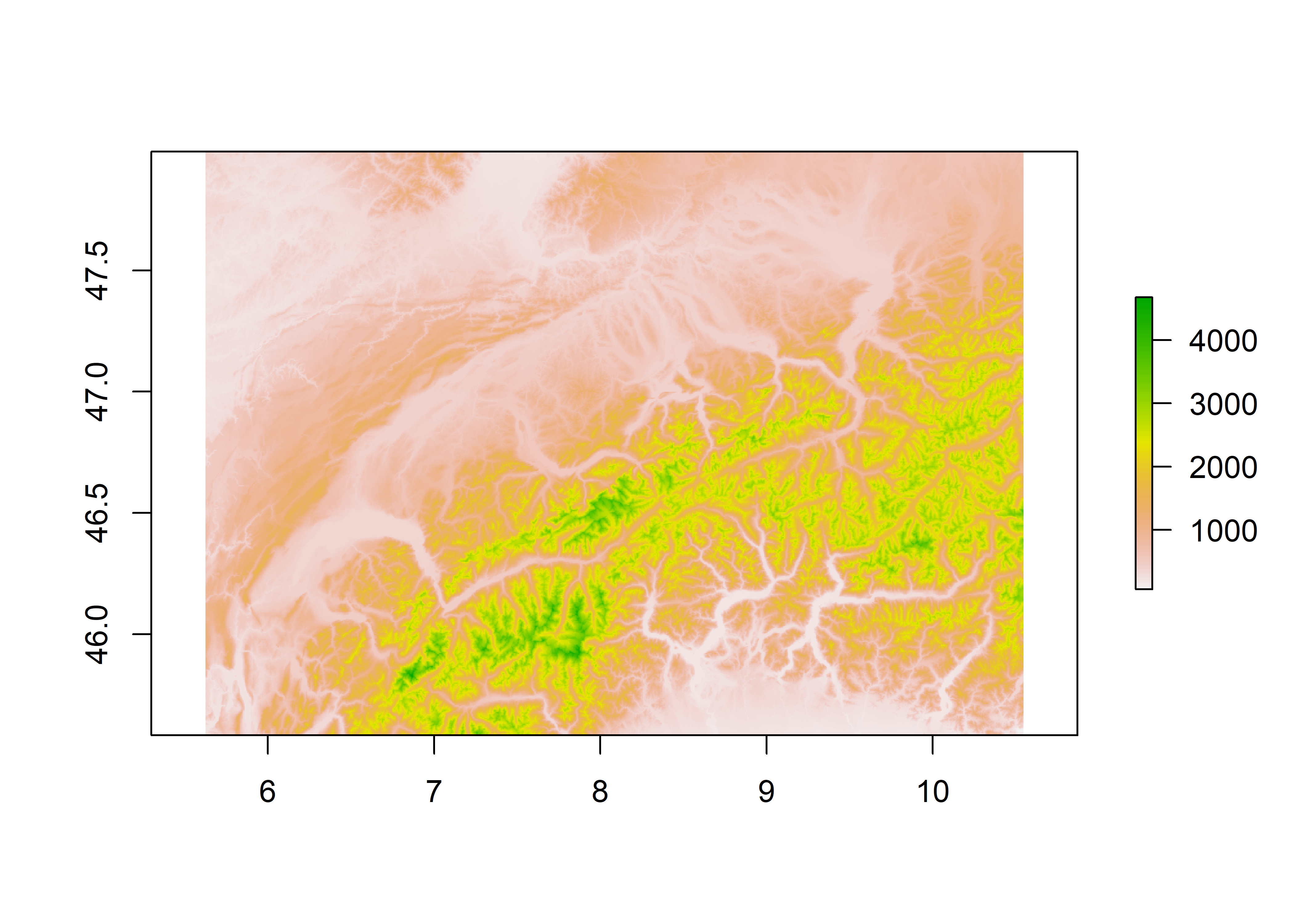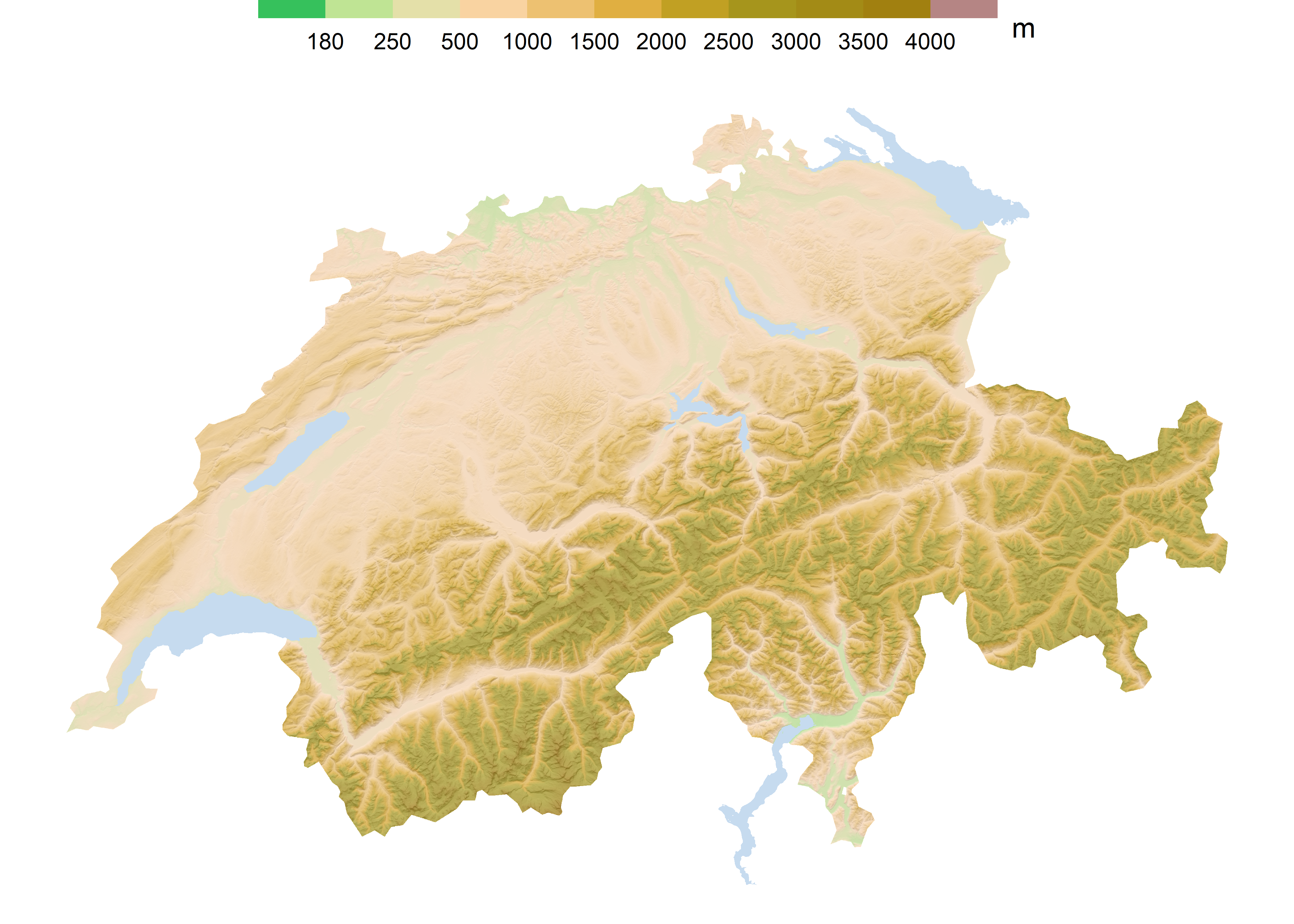 plot(mdt)Before calculating the shadow effect, we create a simple relief map. In ggplot2, we use the geom_raster() geometry, indicating the longitude, latitude and the variable to define the color. We add the boundaries of the lakes using geom_sf() since it is an sf object. Here we only indicate the fill color with a light blue. Then, with the help of scale_fill_hypso_tint_c(), we apply a range of colors corresponding to the relief, also called hypsometric tinting, and we define the breaks in the legend. We make appearance adjustments in the legend and the graph’s style in the rest of the functions.
