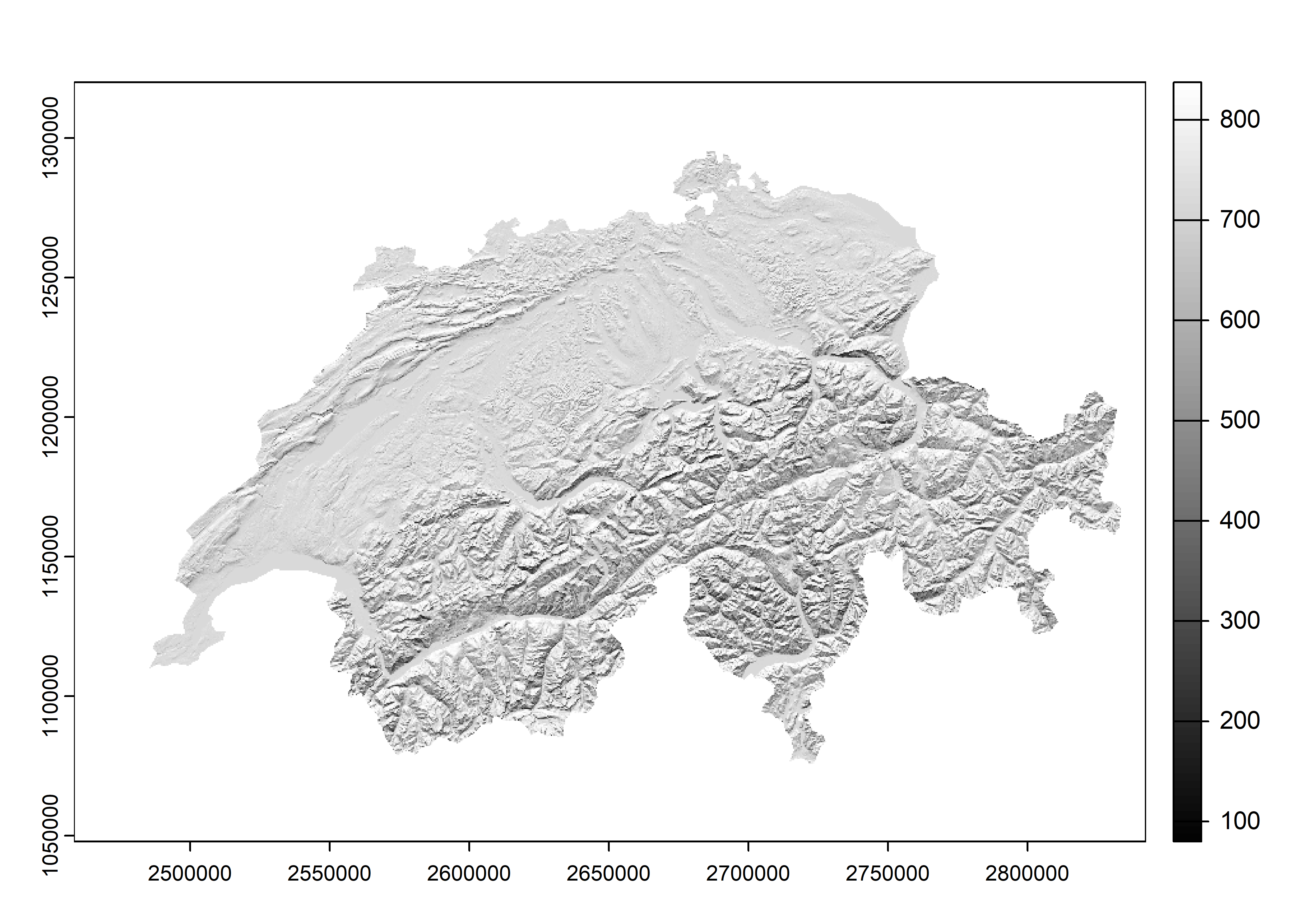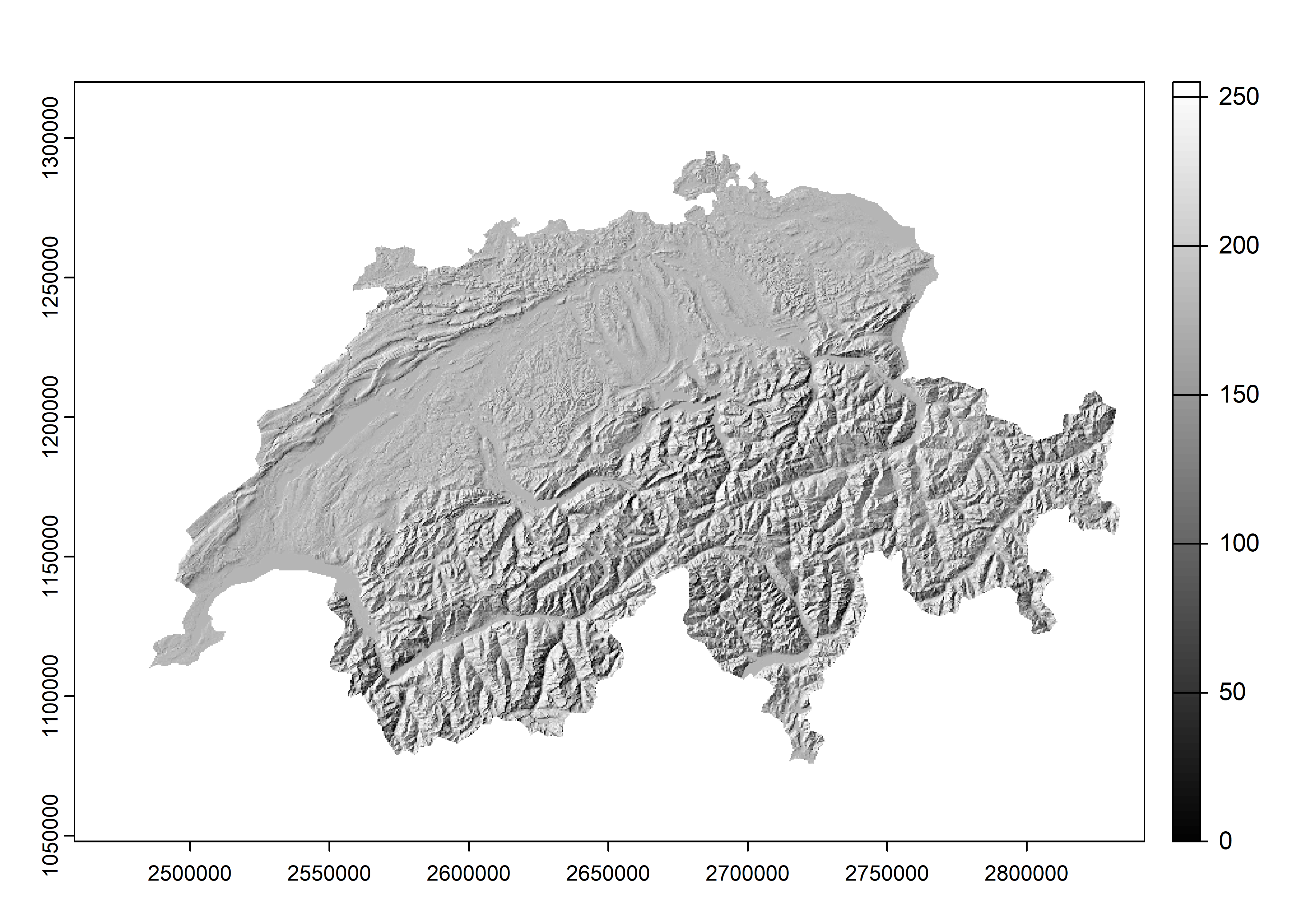plot(hillmulti, col = grey(1:100 / 100))We do the same as before to visualize the relief with multidirectional shadows.