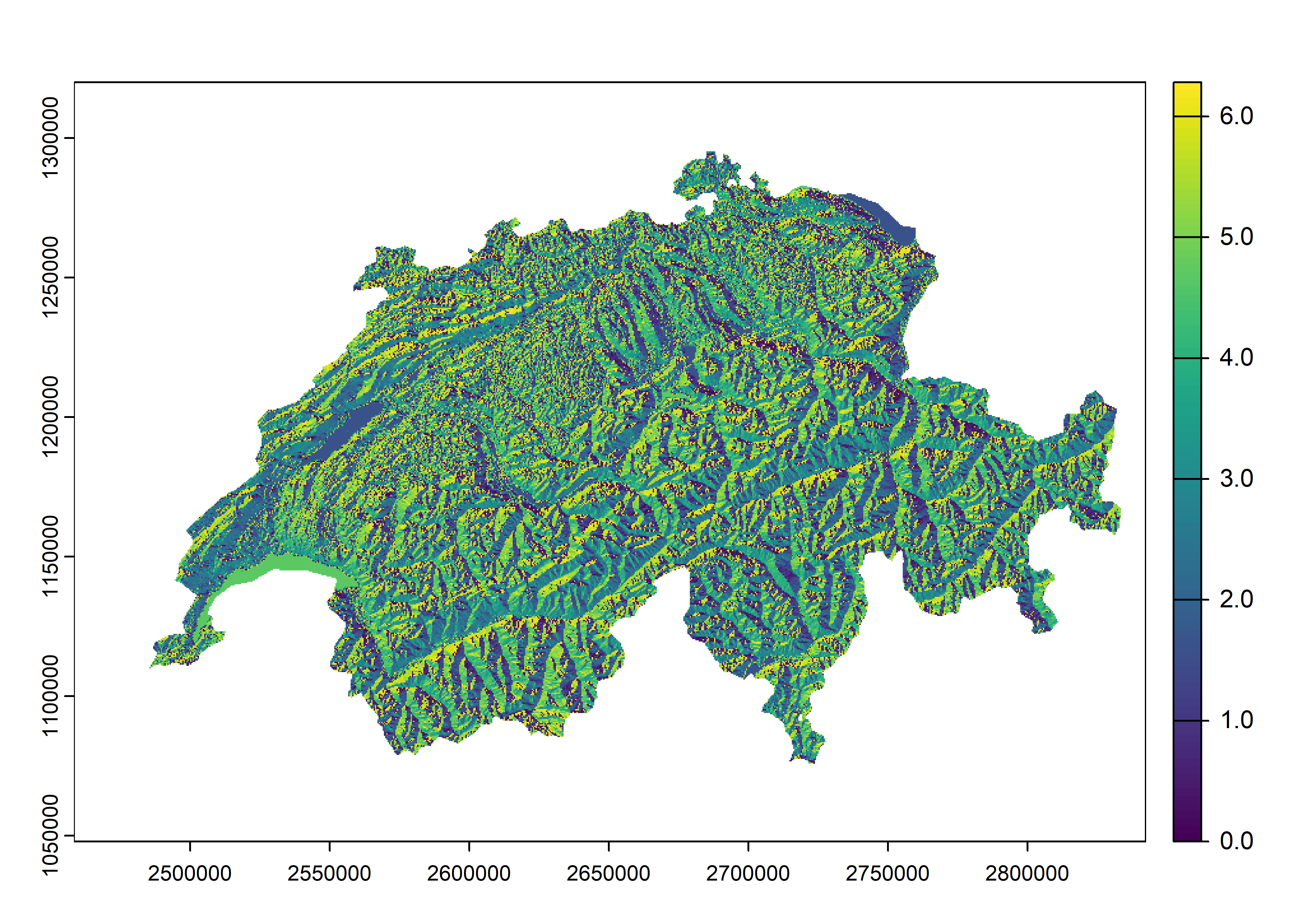 After obtaining the DEM from Switzerland, we must mask the country’s boundaries. The object’s class is RasterLayer from the raster package, however, the new standard is terra with the class SpatRaster. That’s why we convert it and then apply the mask. Finally, we reproject to the Swiss coordinate system obtained from the vector data.