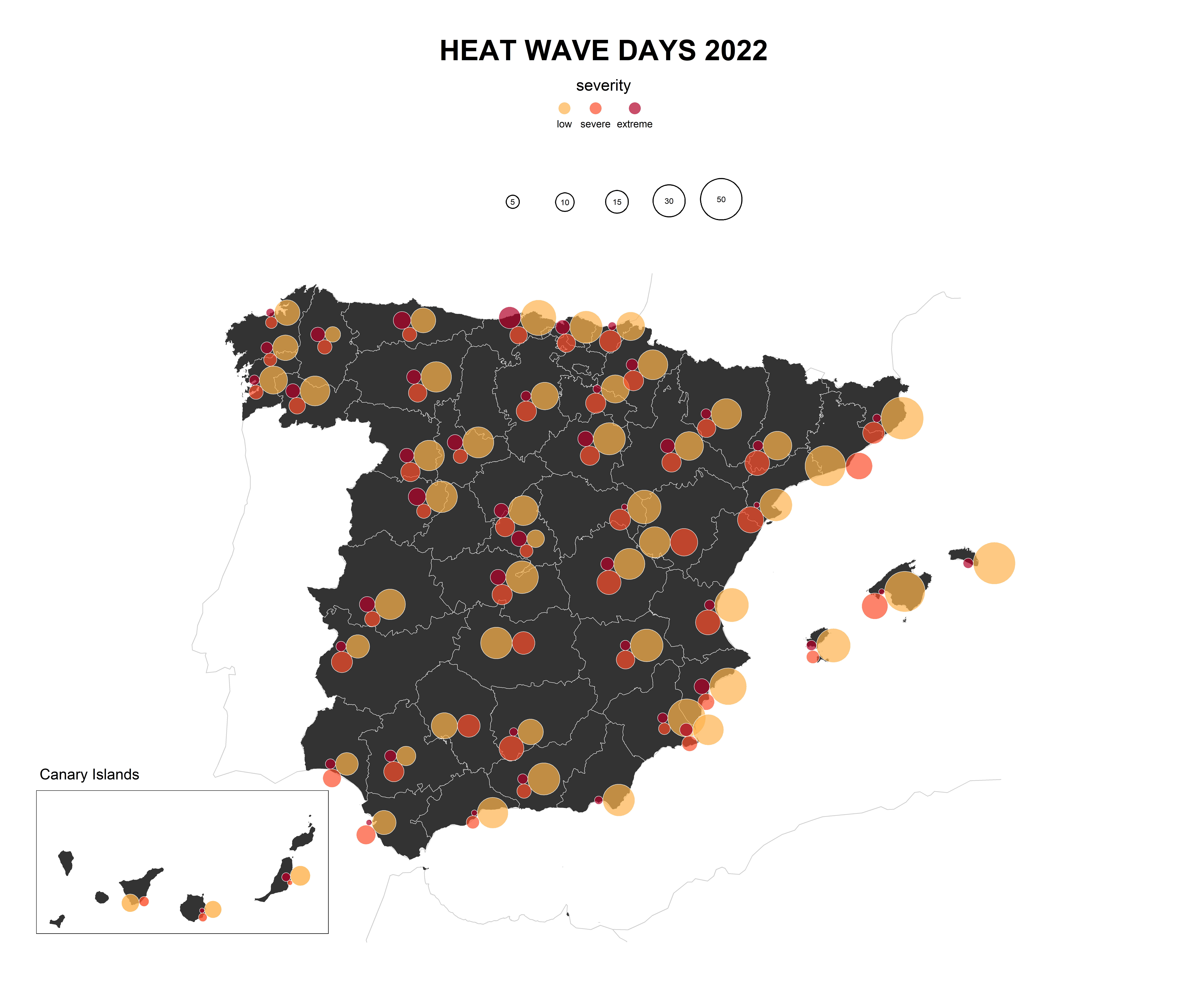 In my first post of 2024, which unfortunately has not been possible before April, I will explain how we can group in the same location several proportional circles. In 2022 I was looking for how to represent the number of heat wave days according to the degree of severity in Spain. I found the solution using the circle packing which is also used in the Dorling cartogram.