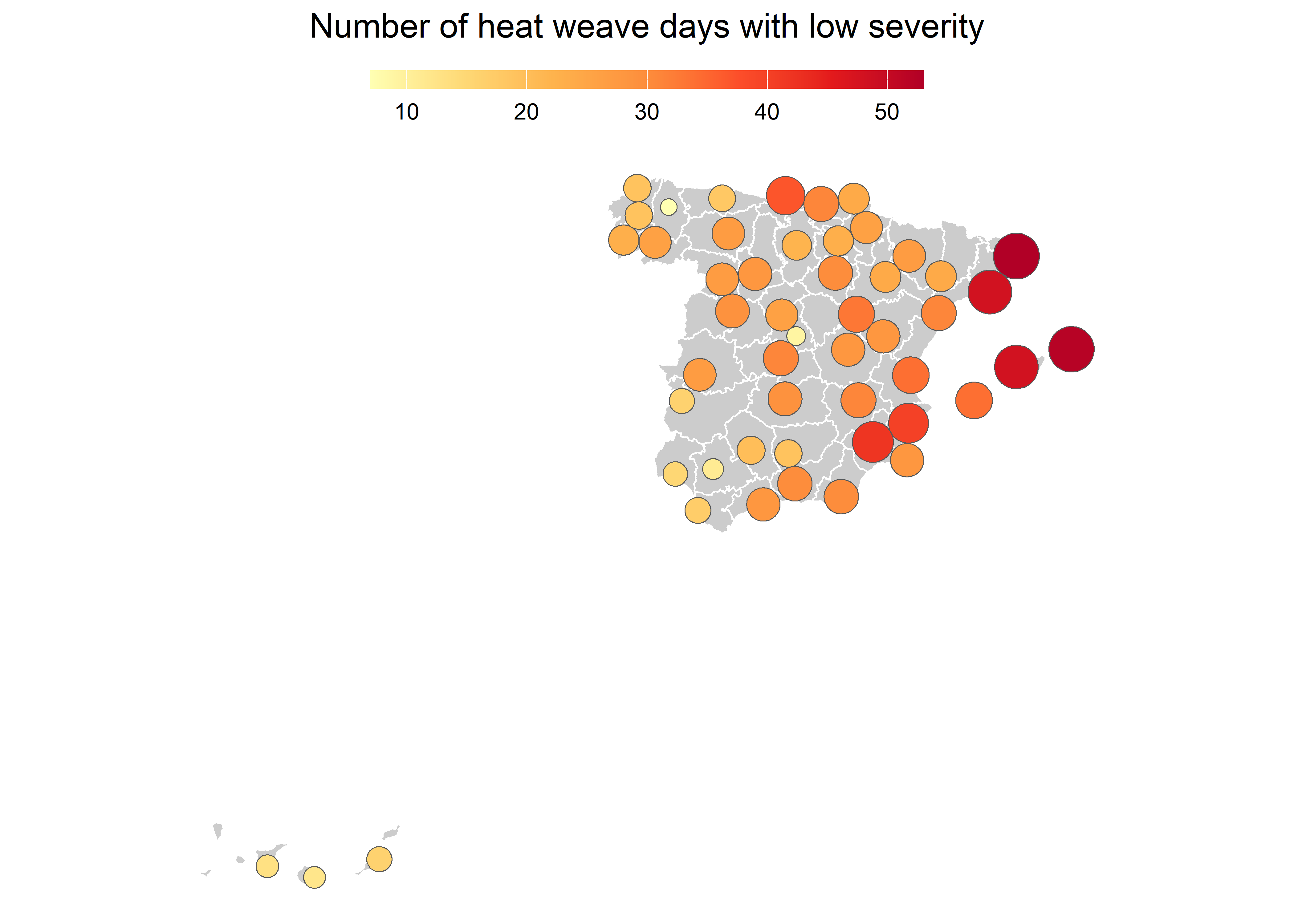 labs(fill = NULL, title = "Number of heat weave days with low severity") +