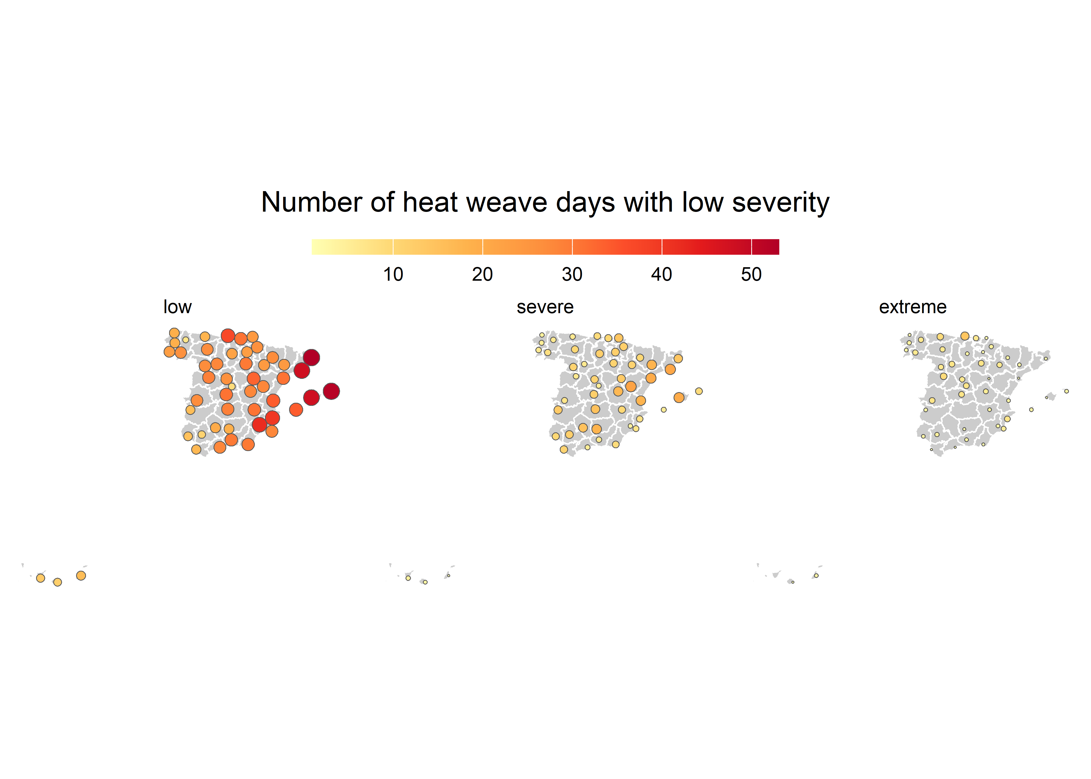 In this post we will use a dataset of heat waves registered in the year 2022 (download). At the time I calculated the Excess Heat Factor index for different locations in Spain. You can find the formulas of the index in Díaz-Poso et al. (2023). It is a geojson with the number of heat wave days according to severity (low, severe, extreme) for 51 weather stations. The data needs to be projected, in this case it is ETRS89 UTM 30 (EPSG:25830). In addition, we import and modify the provincial and global boundaries to use them as a basis for the map.